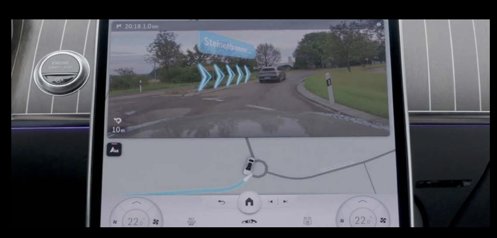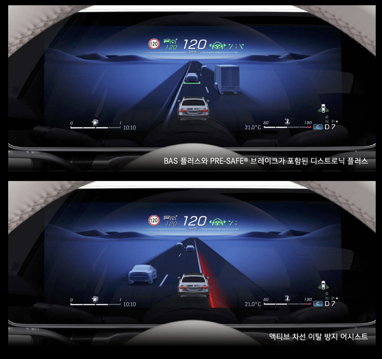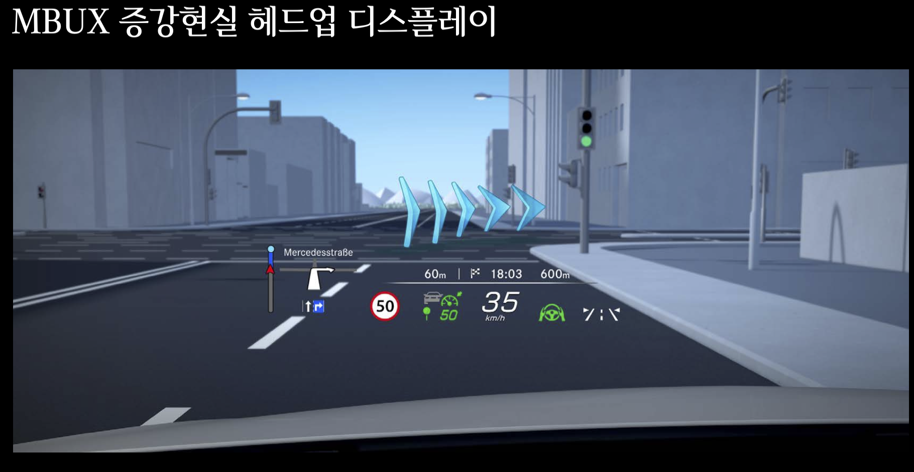 MBUX 증강현실 헤드업 디스플레이는 필요한 정보를 운전자의 시야에 직관적으로 표시합니다. 예를 들어, 내비게이션의 화살표 그래픽은 실제 도로 위에 운전자가 주행해야 하는 방 향으로 표시되며, 직관적인 그래픽을 통해 운전자는 혼선 없이 운전할 수 있습니다. 컬러로 제공되는 데이터는 차량의 전방 10m 앞에 표시되며, 그래픽 요소들은 마치 도로의 일부인 것처럼 자연스럽게 보여집니다. 필요한 경우, 왼쪽 터치 스위치 패널에서 스와이프 동작을 통해 내비게이션 혹은 주행 보조 시스템 기능을 빠르게 활성화시켜 액티브 디스턴스 어시스트 디스트로닉에 대한 정보도 표시할 수 있습니다. 또한, 주변 조도에 맞춰 밝기를 자동으로 조정하여 날씨가 맑은 날 혹은 밝은 색상의 노면에서도 헤드업 디스플레이의 정보를 명확하게 볼 수 있습니다.(S 580 4MATIC L 이상 기본사양, 이외 모델 유료옵션)