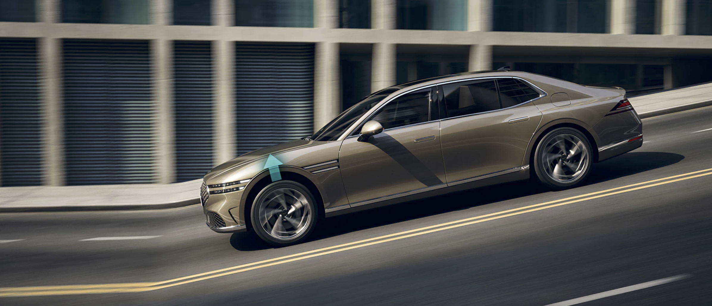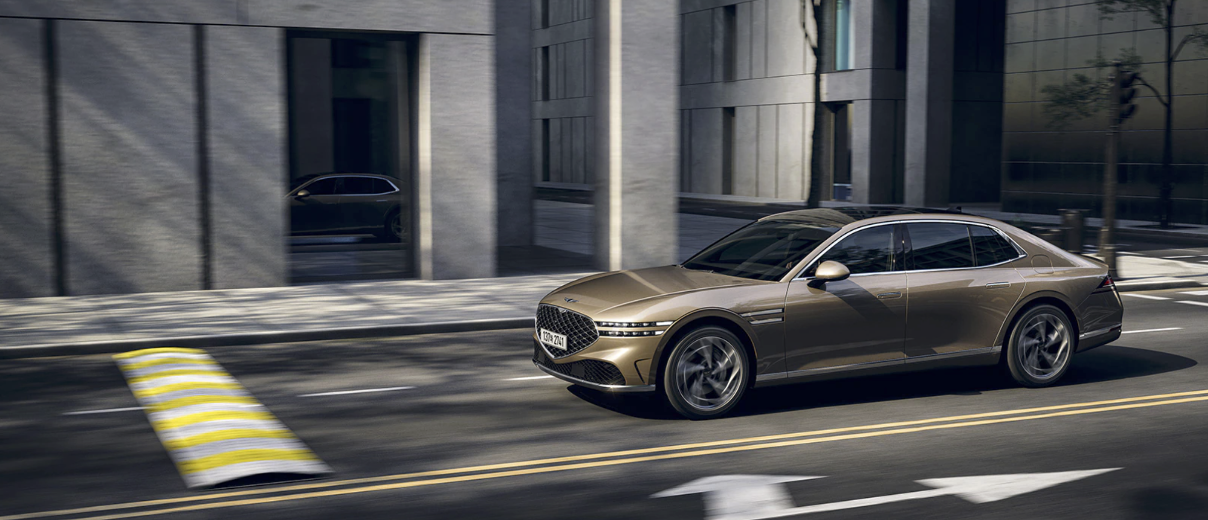 신규 크레스트 그릴과 날렵한 두 줄 램프로 제네시스 엠블럼을 형상화한 전면부는 브랜드 정체성을 더욱 강조합니다. ‘클램쉘 (Clamshell) 후드’ 와 두께를 80% 가까이 줄여 돌출부가 줄어든 ‘기요셰 (Guilloché) 패턴 엠블럼’으로 최고급 럭셔리 세단의 이미지를 연출합니다.