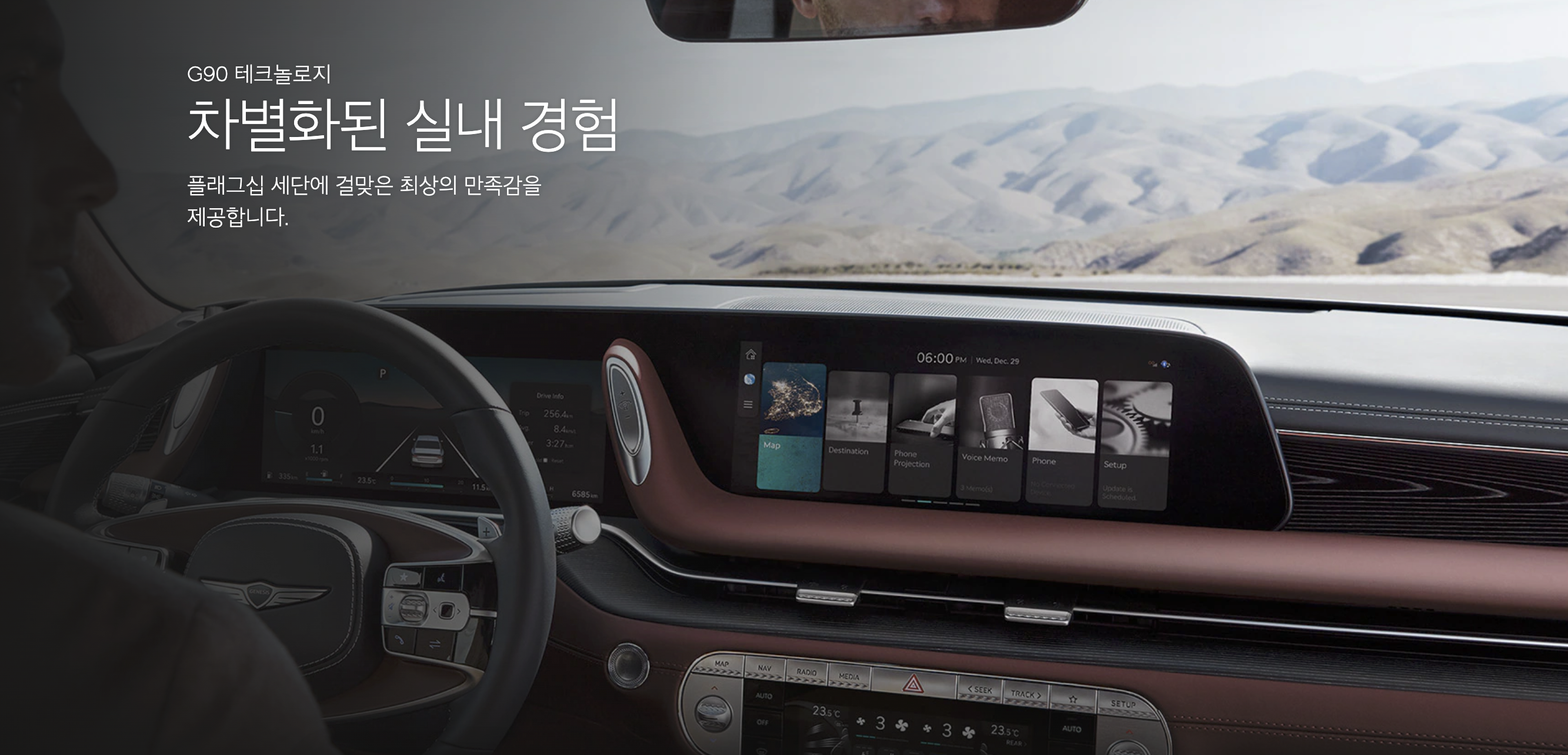 운전석 공간은 제네시스의 실내 디자인 철학 ‘여백의 미’를 바탕으로 신기술이 적용된 첨단 장치 같은 이미지와 아날로그 감성이 담긴 고급스러운 디테일이 조화를 이룹니다. 디지털 인터페이스를 활용한 인포테인먼트 시스템은 운전의 즐거움을 더하고, 새롭게 적용된 무드 큐레이터, 뱅앤올룹슨 프리미어 3D 사운드 시스템과 버추얼 베뉴는 취향에 맞는 실내 무드를 다양하게 연출해줍니다.