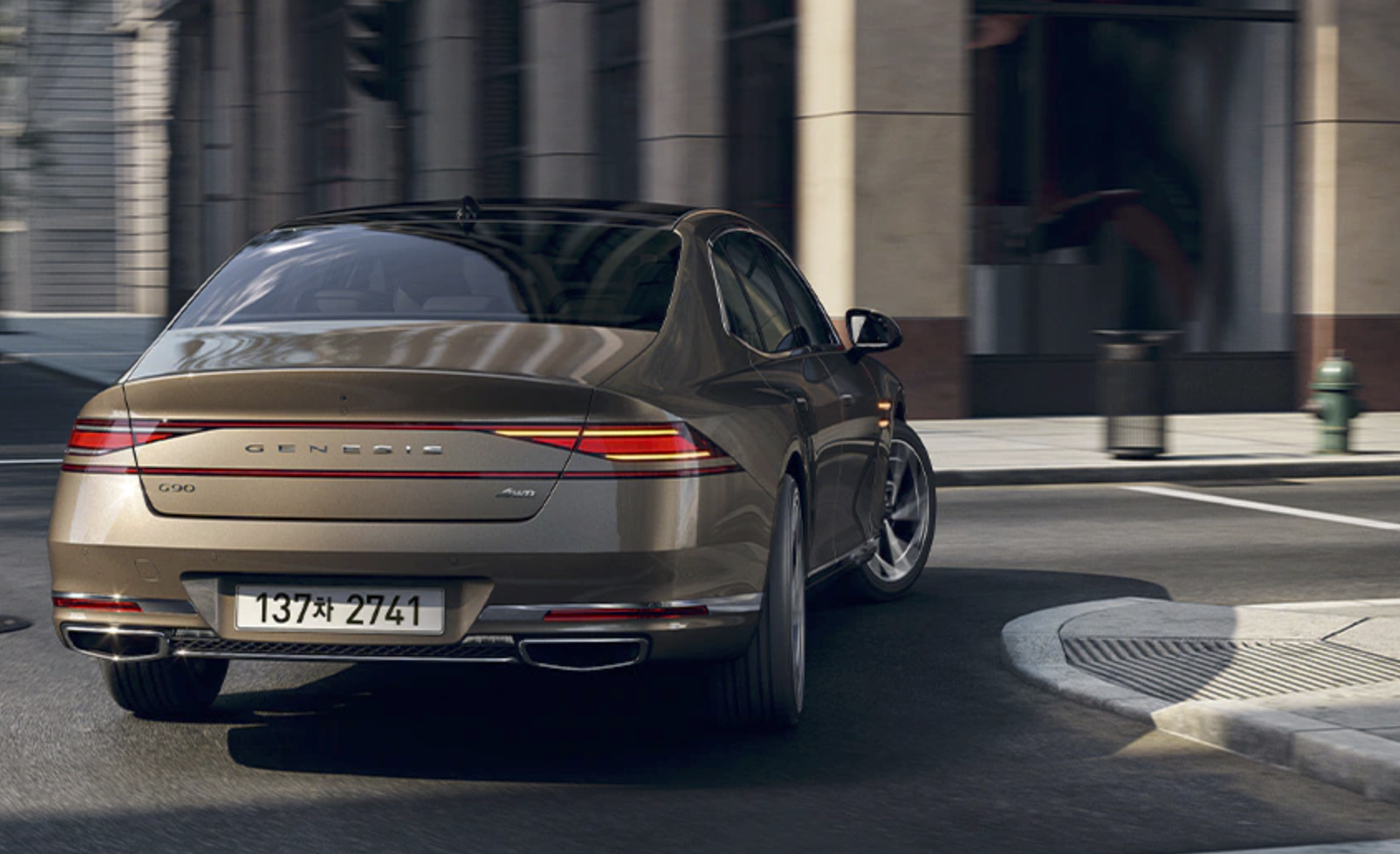 후면부는 제네시스 디자인의 핵심 요소인 두 줄의 리어 콤비램프가 트렁크를 따라 길게 이어져 있으며, 두 줄 사이에 제네시스 레터링 엠블럼을 배치하여 간결함을 더했습니다. 아울러 번호판, 각종 센서, 후진등과 같은 기능적 요소가 하단부로 내려져 깨끗하고 고급스러운 뒷모습을 완성합니다.
