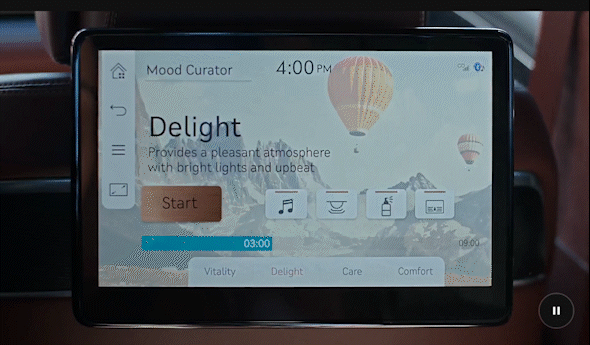 차 안의 음악, 향기, 조명과 커튼, 마사지 기능이 한 번에 연동되어 4가지 무드(바이탈리티, 딜라이트, 케어, 컴포트)를 제공합니다.
