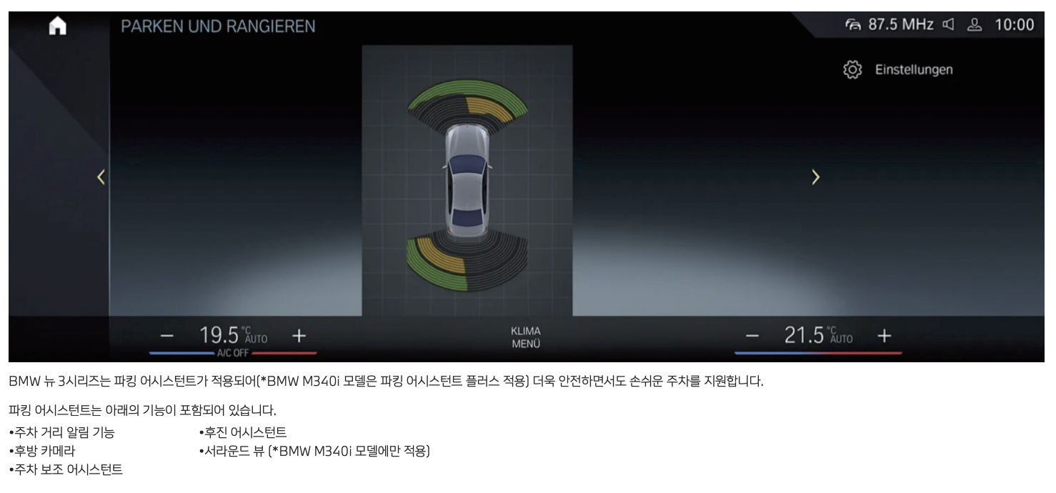 BMW 뉴 3시리즈는 파킹 어시스턴트가 적용되어(*BMW M340i 모델은 파킹 어시스턴트 플러스 적용) 더욱 안전하면서도 손쉬운 주차를 지원합니다. 파킹 어시스턴트는 아래의 기능이 포함되어 있습니다