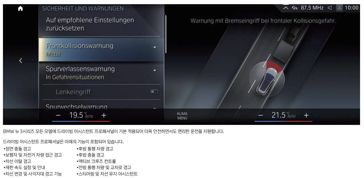 BMW 뉴 3시리즈 모든 모델에 드라이빙 어시스턴트 프로페셔널이 기본 적용되어 더욱 안전하면서도 편리한 운전을 지원합니다. 드라이빙 어시스턴트 프로페셔널은 아래의 기능이 포함되어 있습니다.