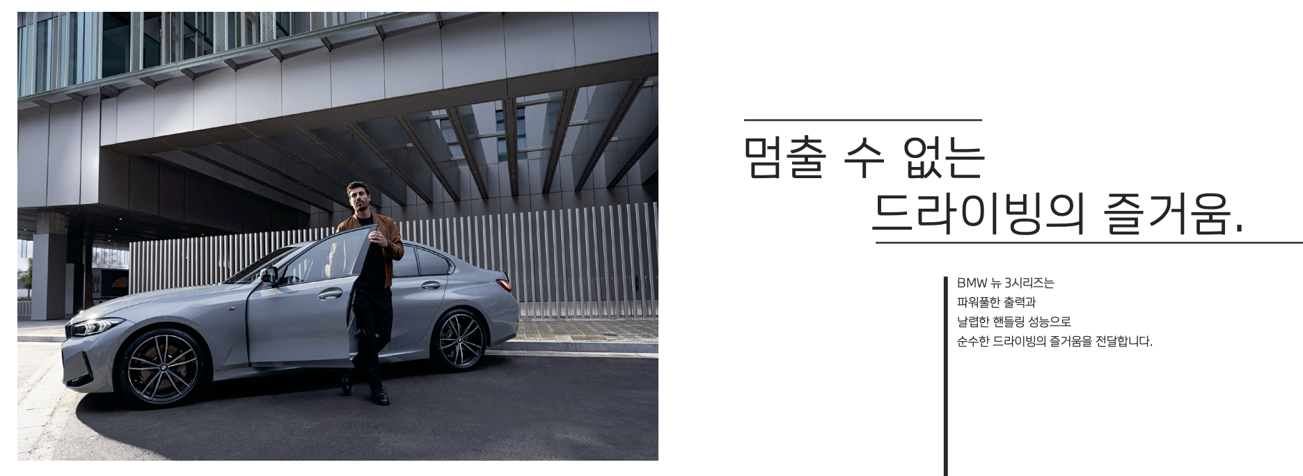 BMW 뉴 3시리즈는 파워풀한 출력과 날렵한 핸들링 성능으로 순수한 드라이빙의 즐거움을 전달합니다