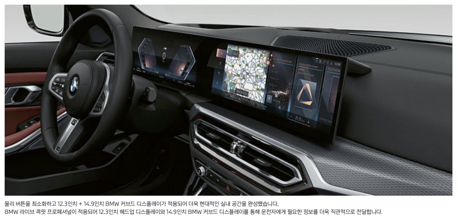 물리 버튼을 최소화하고 12.3인치 + 14.9인치 BMW 커브드 디스플레이가 적용되어 더욱 현대적인 실내 공간을 완성했습니다. BMW 라이브 콕핏 프로페셔널이 적용되어 12.3인치 헤드업 디스플레이와 14.9인치 BMW 커브드 디스플레이를 통해 운전자에게 필요한 정보를 더욱 직관적으로 전달합니다.