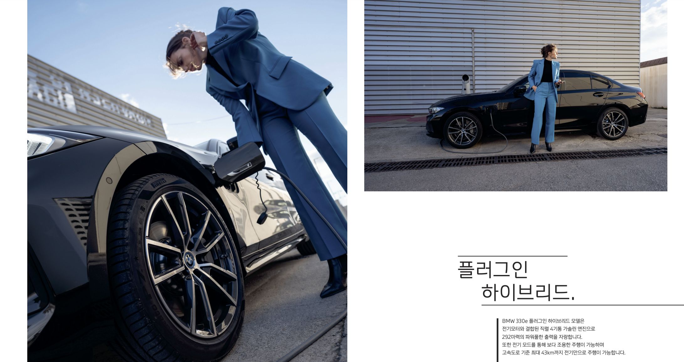 BMW 330e 플러그인 하이브리드 모델은 전기모터와 결합된 직렬 4 기통 가솔린 엔진으로 292마력의 파워풀한 출력을 자랑합니다. 또한 전기 모드를 통해 보다 조용한 주행이 가능하며 고속도로 기준 최대 43km까지 전기만으로 주행이 가능합니다.