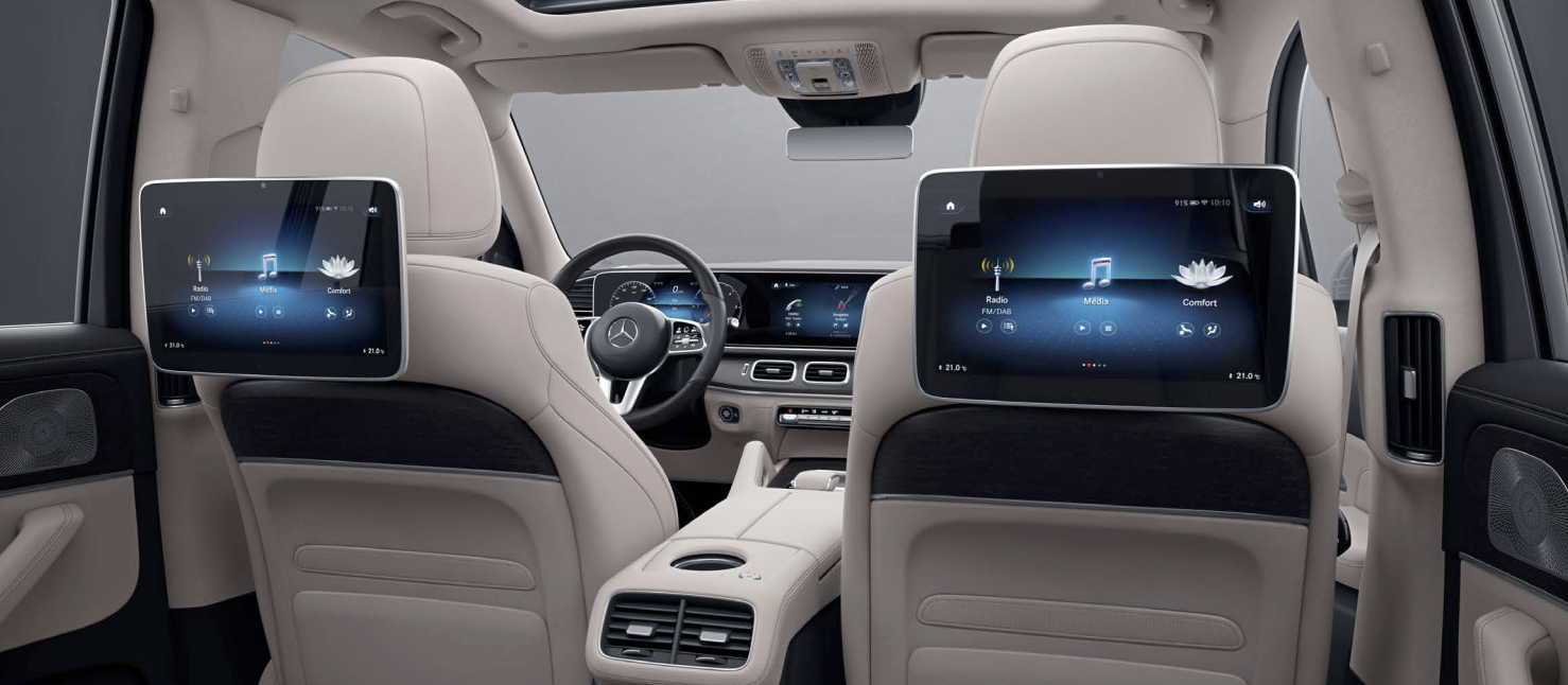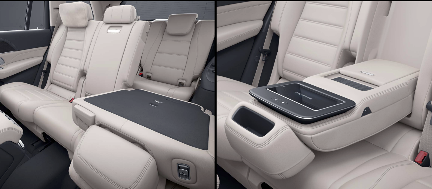 폴딩 시트는 전동으로 움직이도록 하였고 중간 콘솔은 컵홀더와 USB 충전, 무선 충전이 가능 하도록 하였습니다. | 뒷좌석 MBUX 시스템은 FULL HD 터치 디스플레이로 새로운 시스템 경험을 할 수있습니다. |