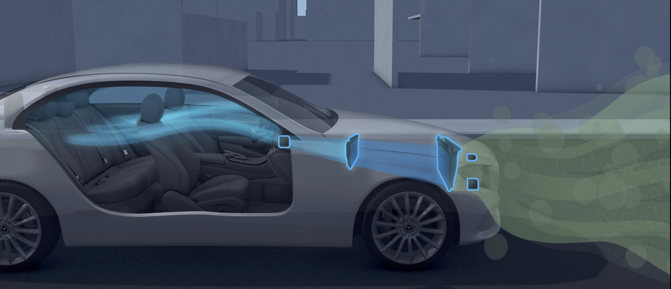 공기청정 패키지는 실외 공기의 질을 파악하여 실내로 유입되는 공기를 두 번의 필터를 통해 걸러집니다. 플리필터와 헤파필터를 거쳐 들어오는 공기는 미세먼지를 99.65% 까지 걸러 낼 수 있습니다. 또한 MBUX를 통해서 공기 질을 모니터링할 수 있습니다.