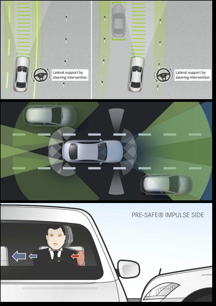 • 재 출발 시간 연장 (30초) • 액티브 조향 어시스트 (핸즈-오프 경고, 액티브 비상 정지 어시스트 포함) • 교차로 기능이 포함 된 액티브 제동 어시스트 • 액티브 사각지대 어시스트 • 하차 경고 어시스트 • 충돌 회피 스티어링 어시스트 • 액티브 차선 이탈 방지 어시스트 • PRE-SAFE® PLUS • PRE-SAFE® IMPULSE SIDE (측면 충돌 감소) |